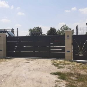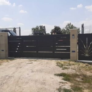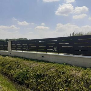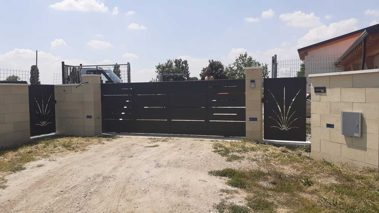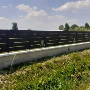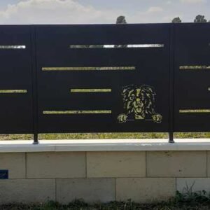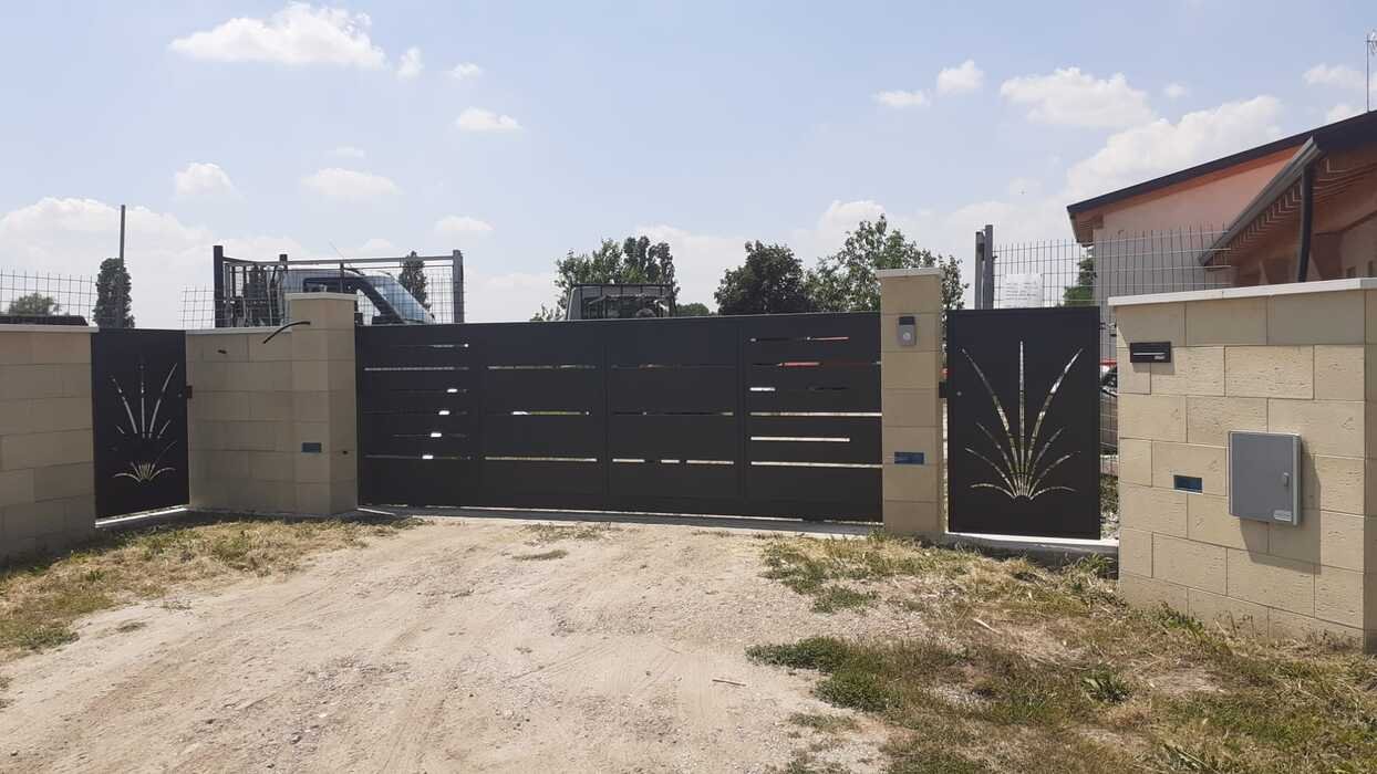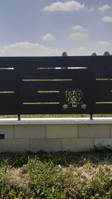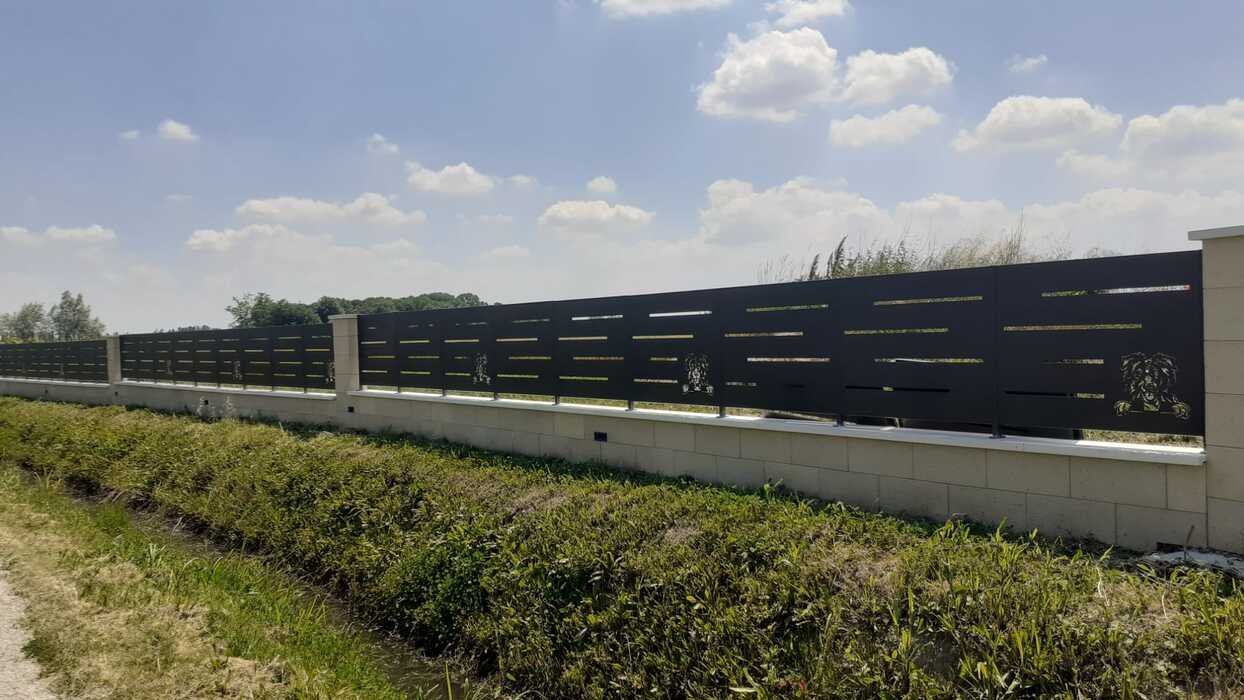 Fornitura di nostra produzione di recinzione in lamiera nostro modello MARE con paletti a tassellare con fessure alternate e con disegno (voluto dal cliente del CANE SUI PANNELLI ) con abbinamento cancello scorrevole e cancelli pedonali il tutto zincato e verniciato a polveri poliestere da esterno e posato in opera da nostri operatori interni.