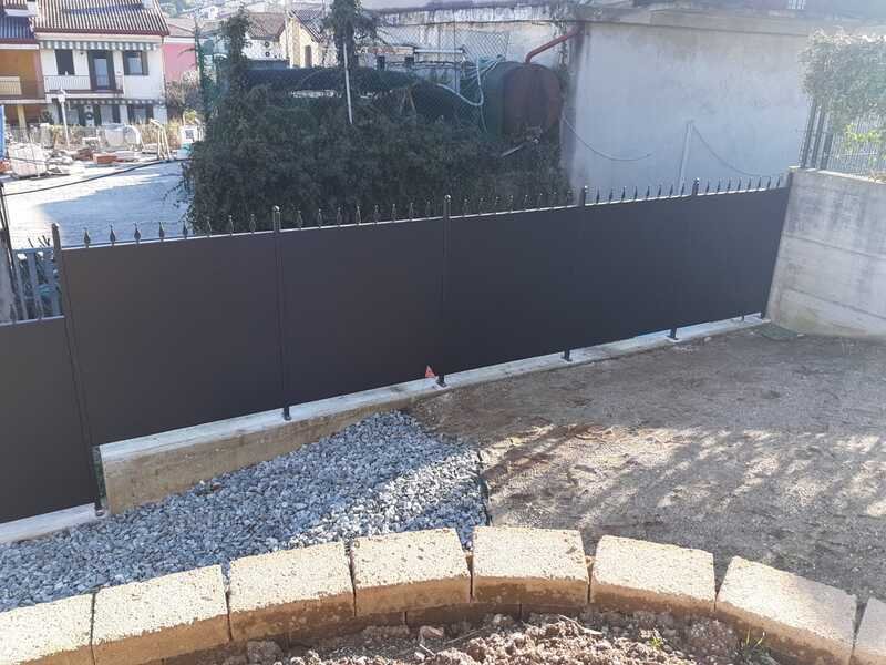 Fornitura di nostra produzione di recinzione (MODELLO LANCIA BIS) h pannello 1130x varie misure in larghezza in tutti i pannelli uguali con abbinamento parapetti poggiolo e cancello pedonale e cancello ad una anta il tutto zincato a caldo e verniciato a polveri poliestere da esterno e verniciato a polveri poliestere da esterno (grigio micaceo) e posato in opera da nostri operatori interni