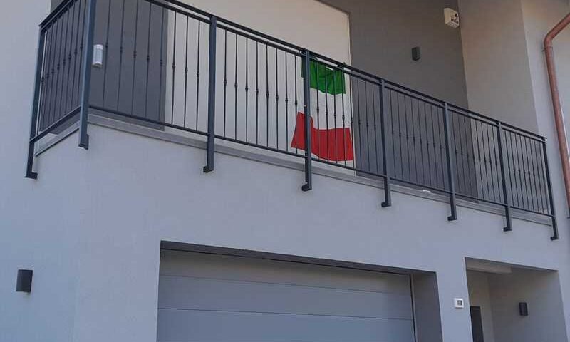 Fornitura di nostra produzione di recinzione (MODELLO LANCIA BIS) h pannello 1130x varie misure in larghezza in tutti i pannelli uguali con abbinamento parapetti poggiolo e cancello pedonale e cancello ad una anta il tutto zincato a caldo e verniciato a polveri poliestere da esterno e verniciato a polveri poliestere da esterno (grigio micaceo) e posato in opera da nostri operatori interni