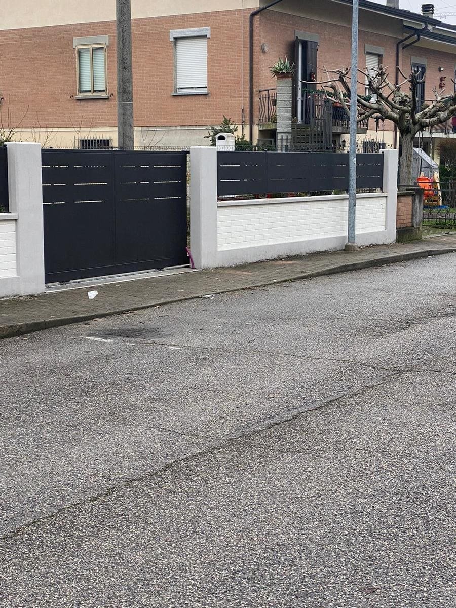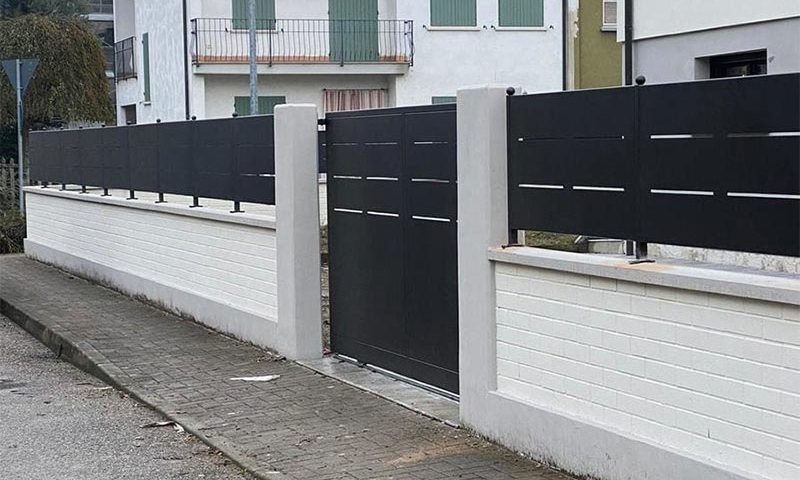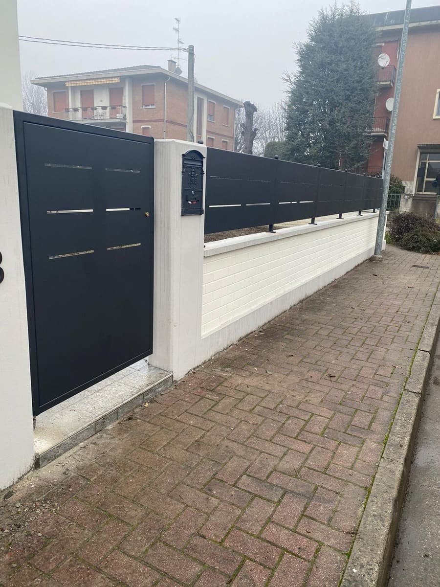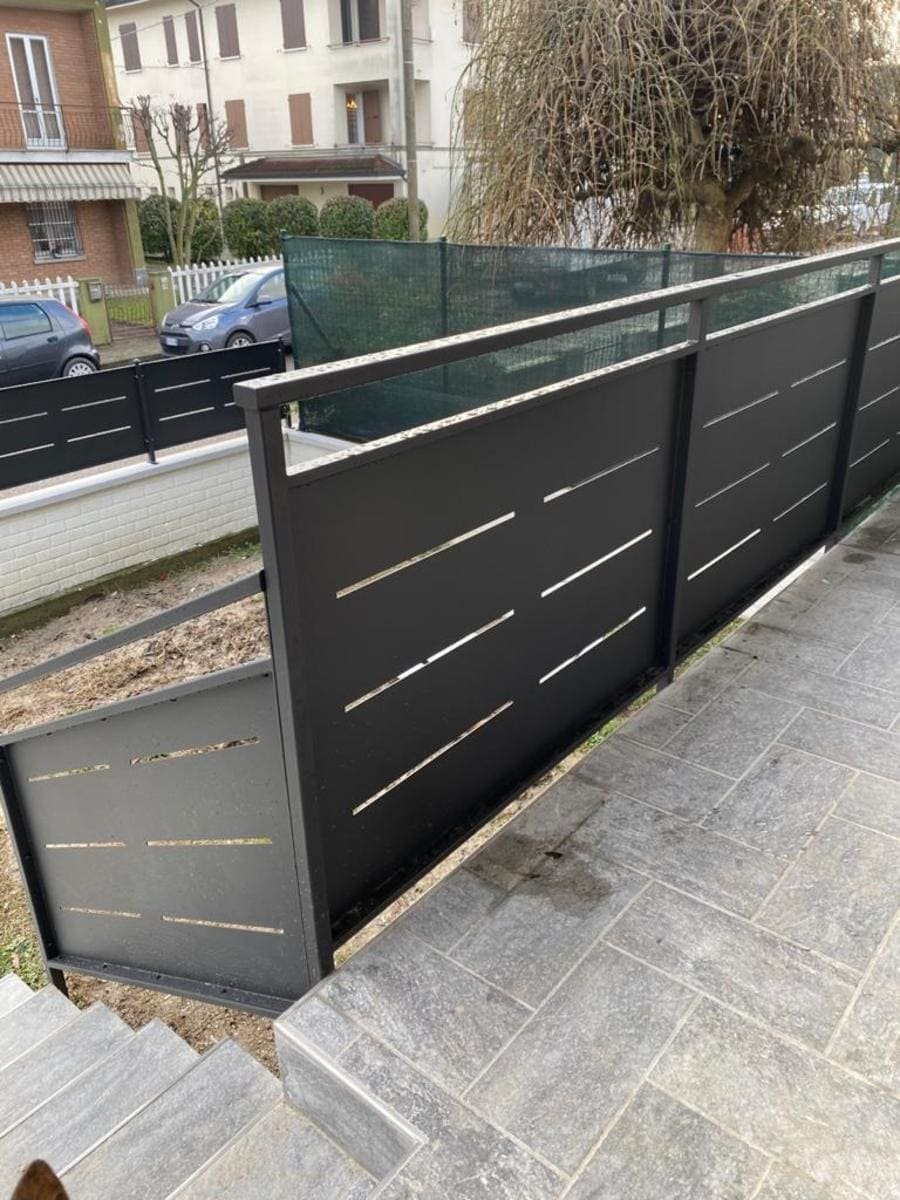 Recinzione modello mare di nostra produzione e fornitura in lamiera, con spessore 30/10 piegata nei 4 lati a forma di scatola, con fessure e paletto (35×35) in tubolare con piastra a tassellare. Abbinamento con cancelli scorrevoli, cancelli pedonali e poggiolo con parapetto modello mare in struttura (35×20) e montanti in tubolare, il tutto zincato e verniciato a polveri poliestere da esterno (grigio micaceo). Posato in opera da nostri operatori interni.