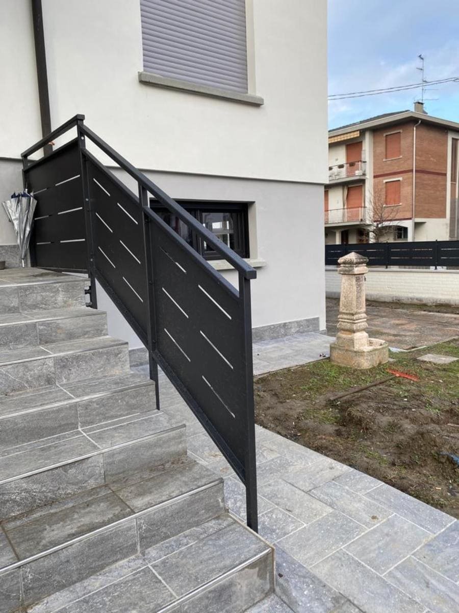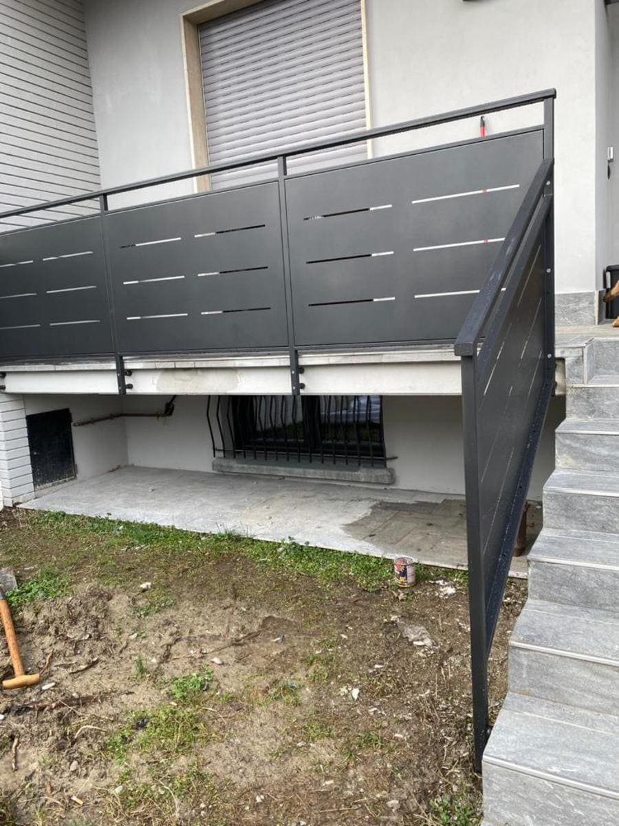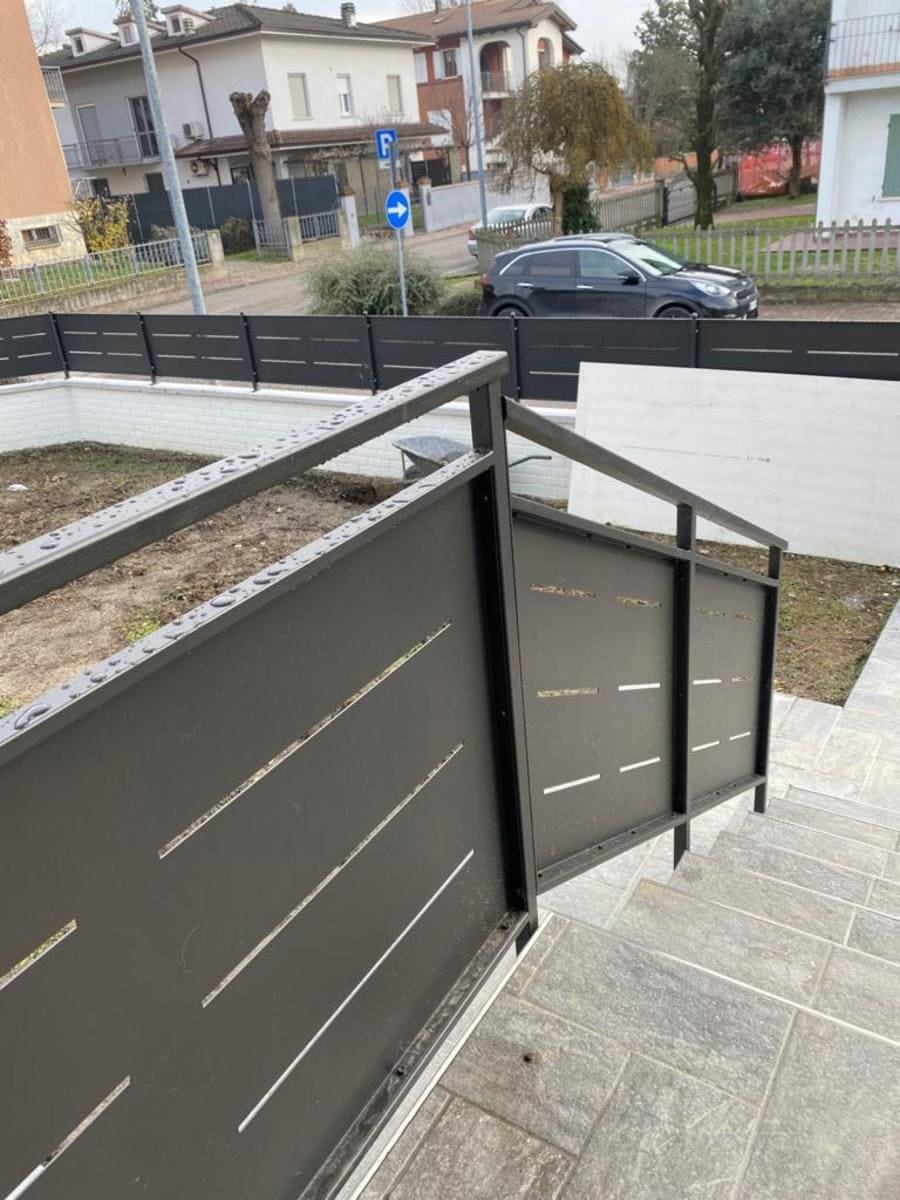 Recinzione modello mare di nostra produzione e fornitura in lamiera, con spessore 30/10 piegata nei 4 lati a forma di scatola, con fessure e paletto (35×35) in tubolare con piastra a tassellare. Abbinamento con cancelli scorrevoli, cancelli pedonali e poggiolo con parapetto modello mare in struttura (35×20) e montanti in tubolare, il tutto zincato e verniciato a polveri poliestere da esterno (grigio micaceo). Posato in opera da nostri operatori interni.