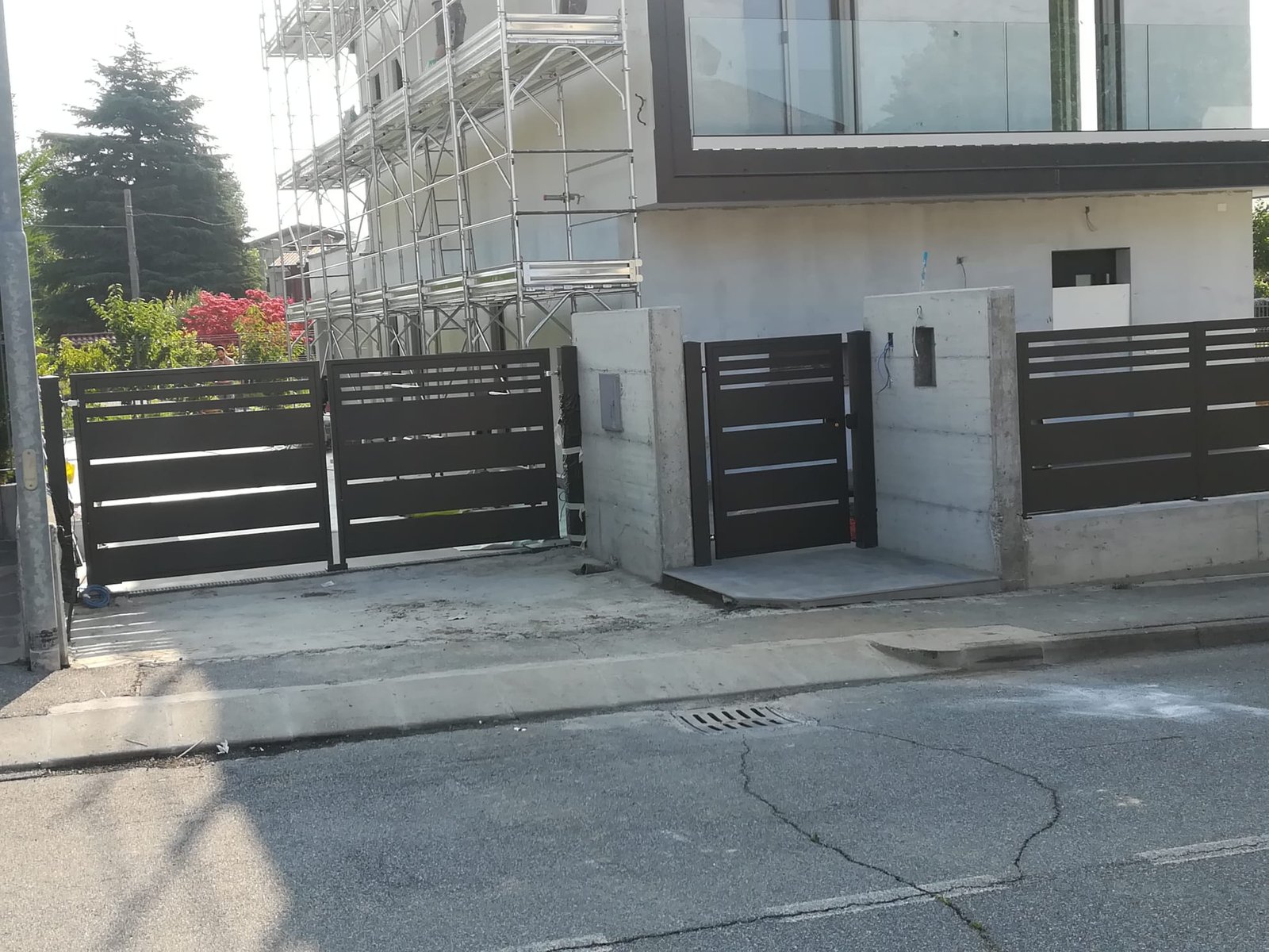 Recinzione modello mare di nostra produzione e fornitura con personalizzazioni del cliente, composta da lamiera e da paletti in tubolare 35x35 spessore 3mm con piastra a tassellare. Abbinamento con cancelli pedonali e cancelli a due ante (modello mare), il tutto zincato a caldo e verniciato a polveri in poliestere da esterno. Posato in opera da nostri operatori interni.