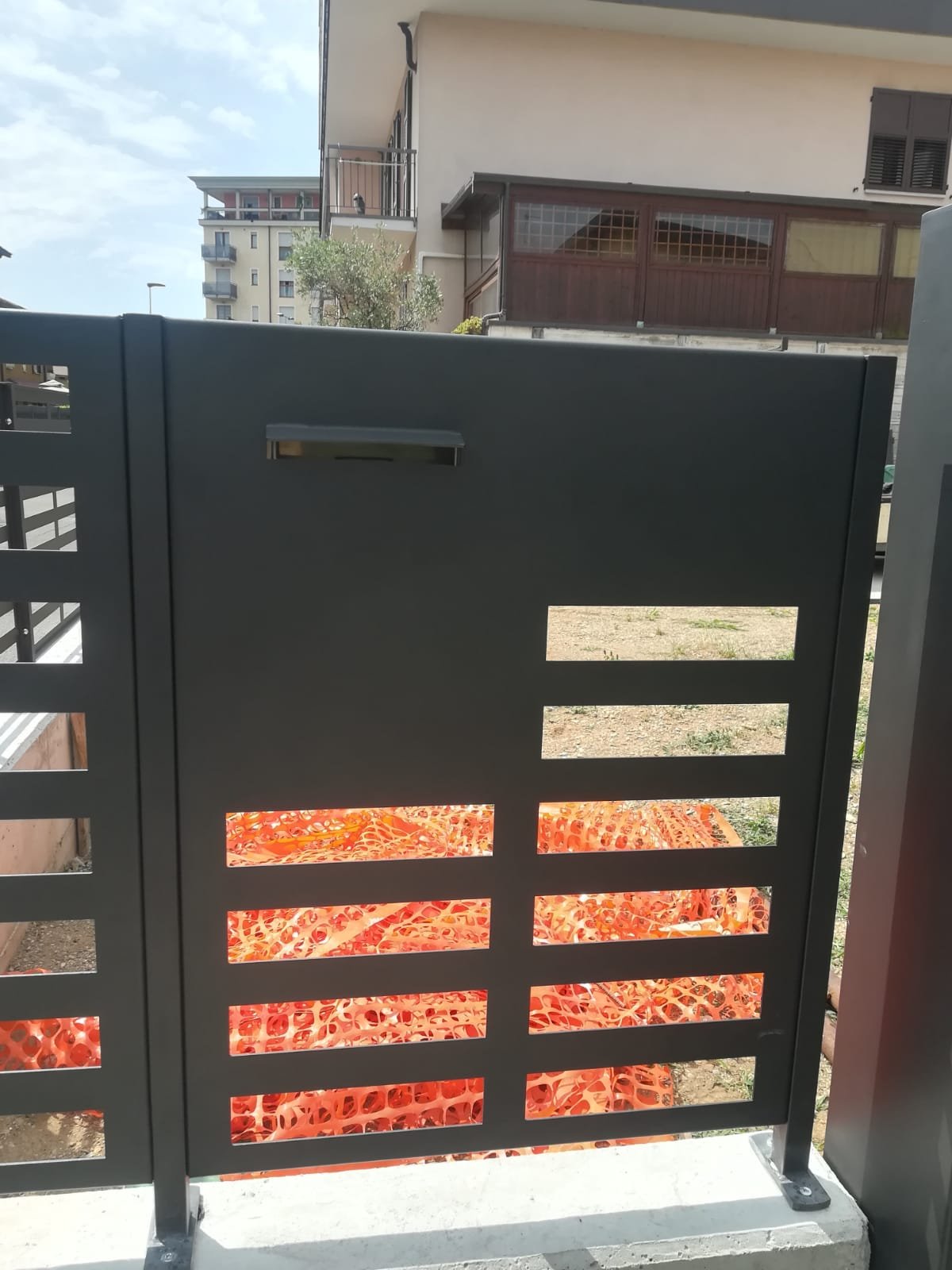 Recinzione modello mare di nostra produzione e fornitura, con fessure personalizzate dal cliente. La recinzione è composta da paletti 35x35 in tubolare spessore 3mm con piastra a tassellare. In abbinamento con cancelli pedonali e cancelli scorrevoli (modello mare), il tutto zincato a caldo e verniciato a polveri in poliestere da esterno. Posato in opera da nostri operatori interni.