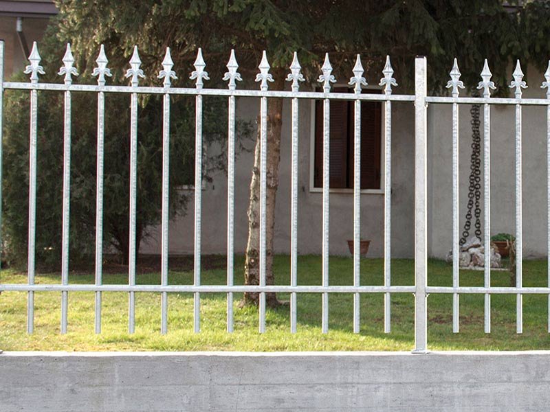 Piantone tubolare da 35×35 a cementare o con staffa a tassellare. Longaroni orizzontali superiori ed inferiori in ferro con sezione a “U”(20x35x20 sp.3). Elementi verticali in tondo pieno Ø12 con decorativi alternati.