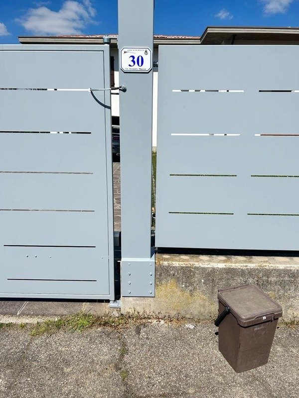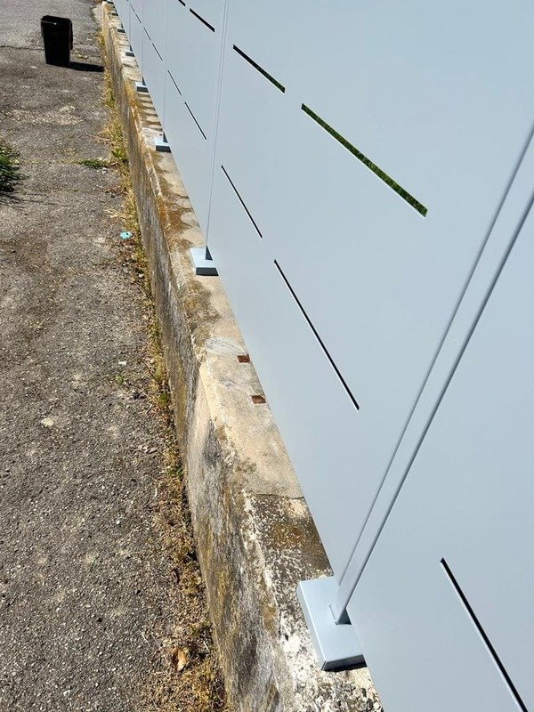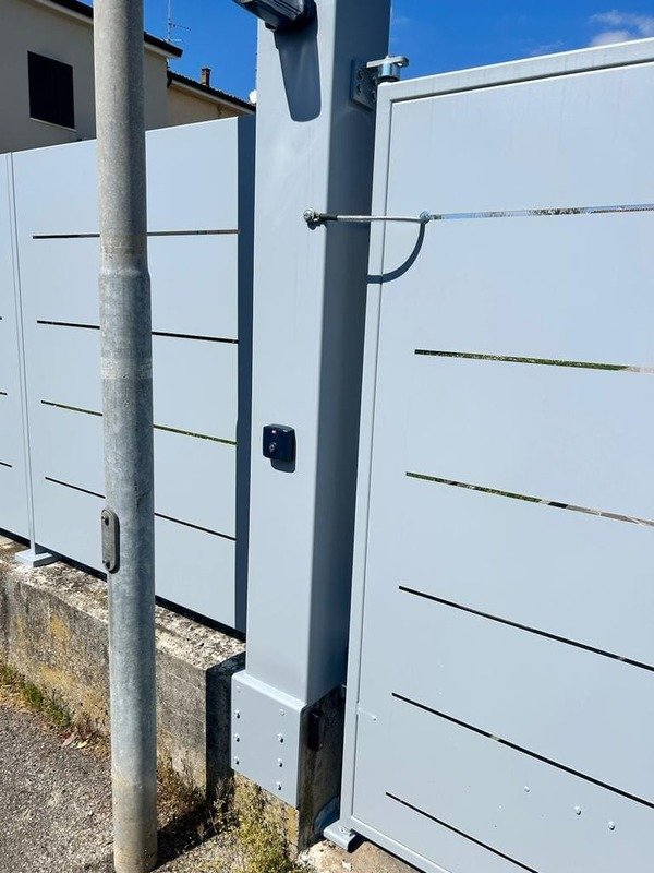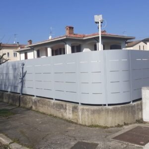 Fornitura di nostra produzione di recinzione nostro modello Mare in lamiera con abbinamento cancello pedonale e cancello a due ante il tutto zincato e verniciato a polveri poliestere da esterno e posato in opera da nostri operatori interni.