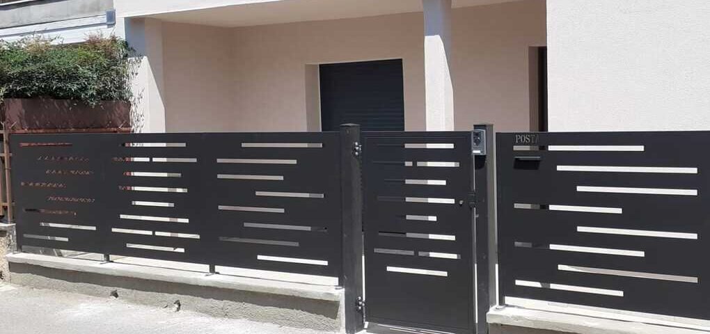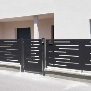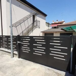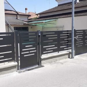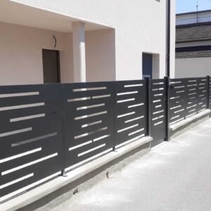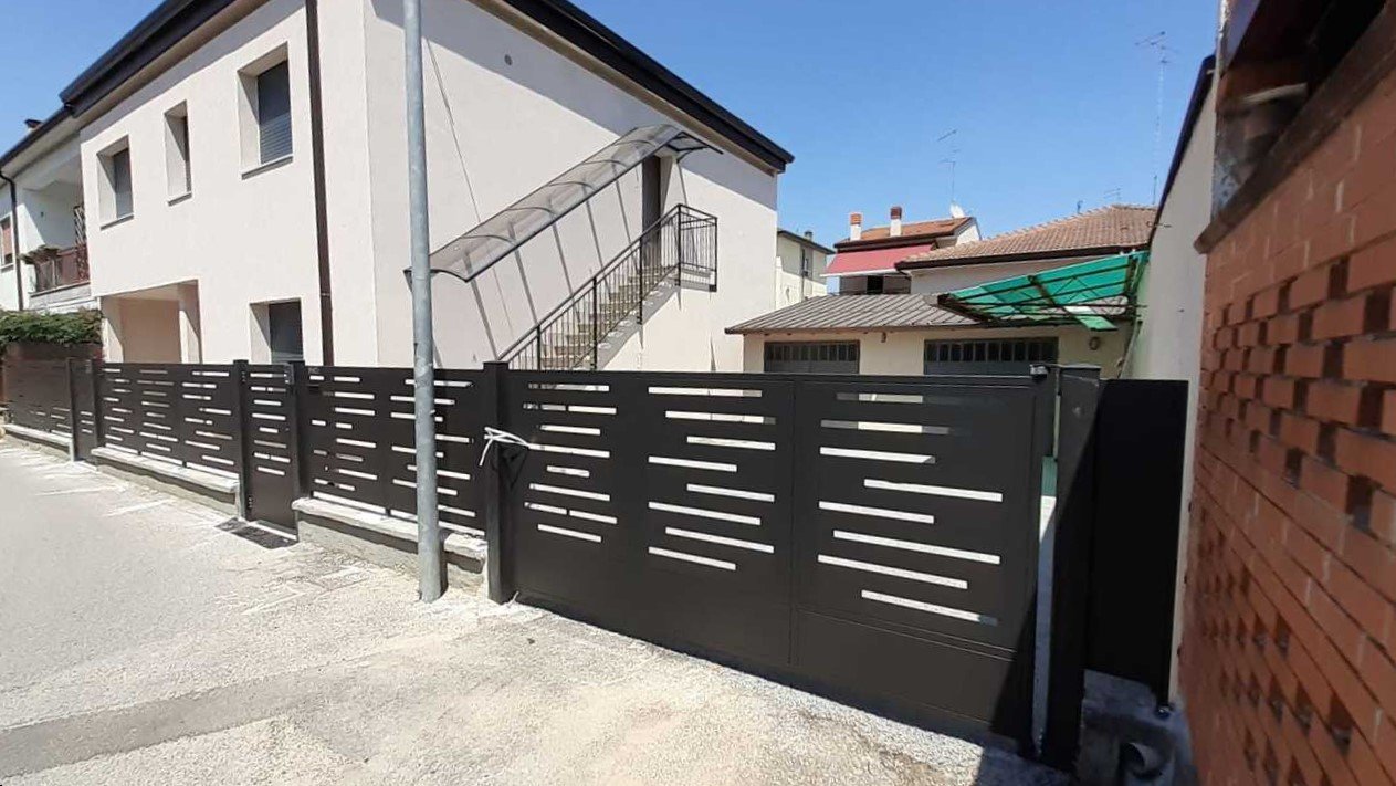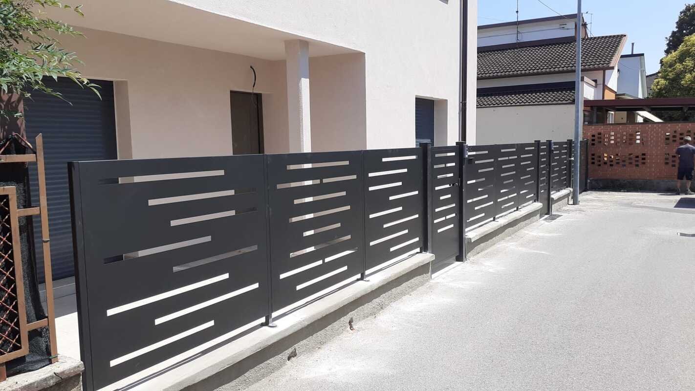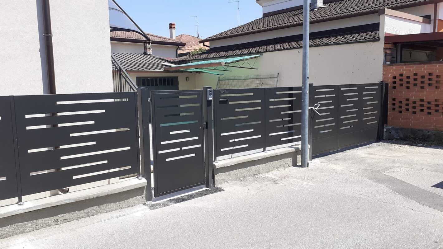 Fornitura di nostra produzione di recinzione nostro modello MARE con fessure alternate con paletto in tubolare da 35x35 il tutto con abbinamento cancello pedonale e cancello scorrevole il tutto zincato e verniciato a polveri poliestere da esterno e posato in opera da nostri operatori interni.