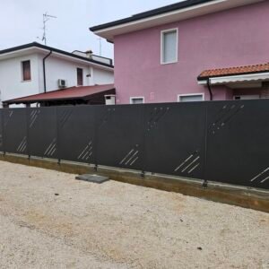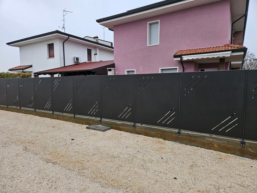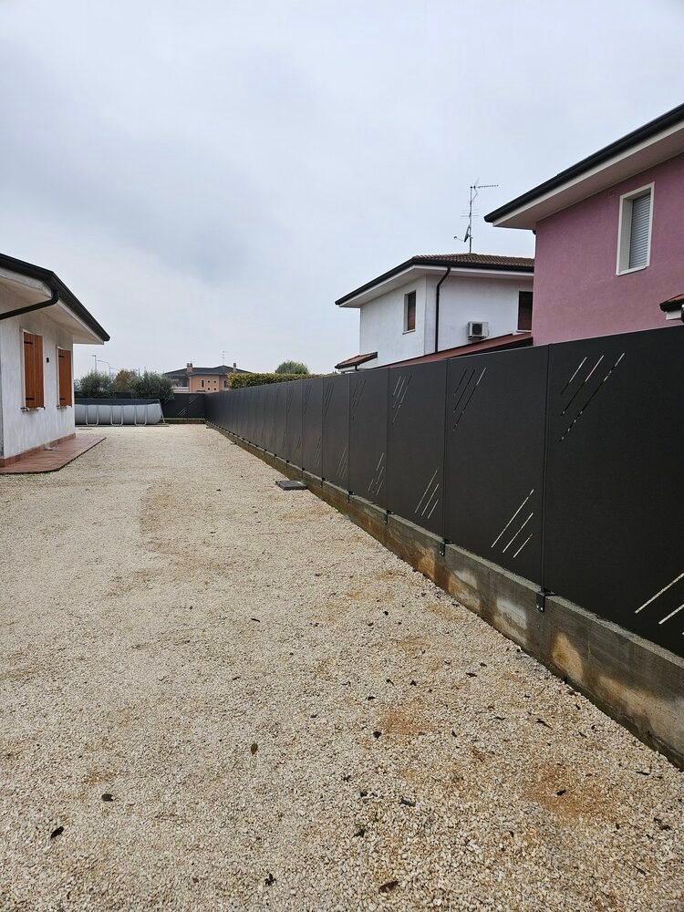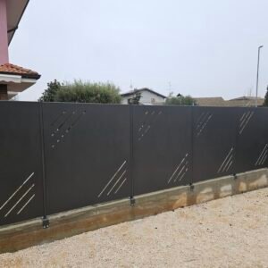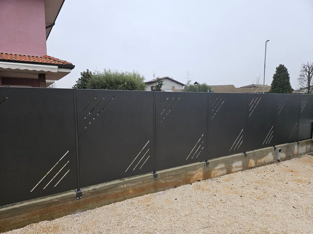 Fornitura di nostra produzione di recinzione in lamiera nostro modello con fessure laterali. Spessore 25/10 piegata nei 4 lati a forma di scatola con fessure paletto in tubolare da 50x30 h 1500 e con piastra tassellare. Il tutto zincato e verniciato a polveri poliestere da esterno e posato in opera da nostri operatori interni.