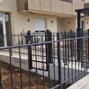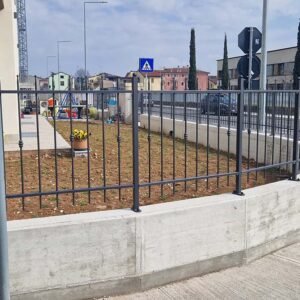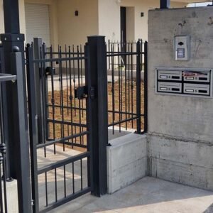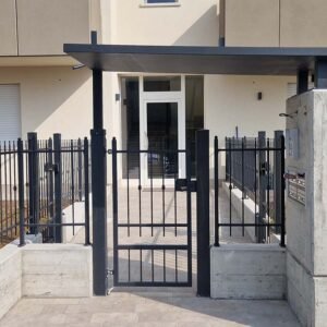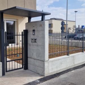 Fornitura di nostra produzione di recinzione nostro modello ELEGANT BIS CON BORCHIA con profilo ad u da 20x35x20x2 tamponatura interna in tondo 12 liscio con pallina sopra paletto in tubolare con piastra tassellare il tutto zincato e verniciato a polveri poliestere da esterno e posato in opera Con abbinamento cancelli pedonali e cancello a due ante con tettoia in lamiera su ogni cancellino sempre posato il tutto da nostri operatori interni